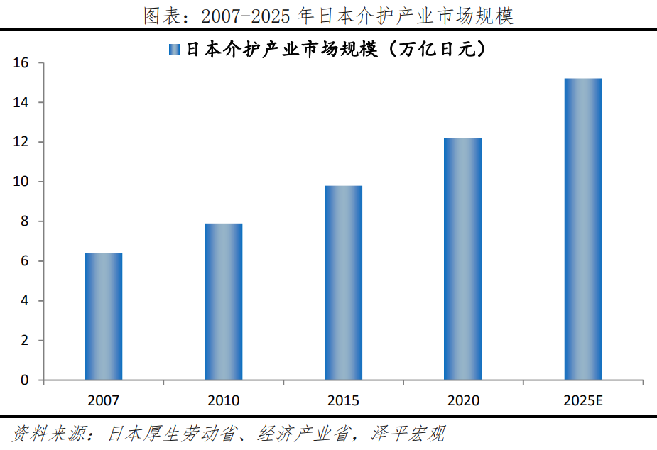1)護(hù)理產(chǎn)業(yè)方面,日本介護(hù)市場(chǎng)規(guī)模持續(xù)快速增長(zhǎng),在《介護(hù)保險(xiǎn)》支持下,老年人介護(hù)產(chǎn)業(yè)呈現(xiàn)出高度標(biāo)準(zhǔn)化、多樣化和個(gè)性化的發(fā)展特征。2007-2025年,平均年增長(zhǎng)率在8%左右,遠(yuǎn)高于同期老年人口平均增長(zhǎng)率(約2%)。老年人介護(hù)產(chǎn)業(yè)依托補(bǔ)貼與護(hù)理保險(xiǎn)報(bào)銷政策,滿足全層次老年人個(gè)性化需求。SOMPO Care(日本財(cái)產(chǎn)保險(xiǎn)公司)提供服務(wù)涵蓋機(jī)構(gòu)養(yǎng)老、居家護(hù)理和日間護(hù)理,覆蓋多樣化護(hù)理場(chǎng)景。