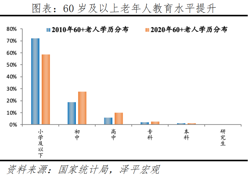 教育水平方面,2010-2020年,60歲及以上人口中,擁有高中及以上文化程度的占比從9.1%提升至13.9%。隨著人口整體受教育水平提升,后續(xù)步入老齡的人口文化素質(zhì)更高,將帶動(dòng)整體老年群體受教育水平提升。