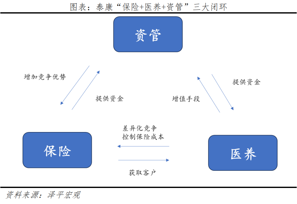 泰康通過(guò)跨界醫(yī)養(yǎng)產(chǎn)業(yè)布局,實(shí)現(xiàn)虛擬保險(xiǎn)產(chǎn)品與實(shí)際醫(yī)養(yǎng)服務(wù)結(jié)合,構(gòu)建“保險(xiǎn)+醫(yī)養(yǎng)+資管”三大閉環(huán)。泰康之家定位于高端養(yǎng)老服務(wù),致力于打造“都市醫(yī)養(yǎng)社區(qū)”。客戶通過(guò)購(gòu)買泰康指定的養(yǎng)老保險(xiǎn)產(chǎn)品,可在泰康的養(yǎng)老體系中享受養(yǎng)老服務(wù);通過(guò)購(gòu)買健康保險(xiǎn)產(chǎn)品,可在泰康的醫(yī)療健康體系中獲得醫(yī)療服務(wù);資產(chǎn)管理則為客戶的健康和養(yǎng)老需求儲(chǔ)備物質(zhì)財(cái)富。通過(guò)閉環(huán)整合,泰康之家有效控制保險(xiǎn)成本,提升保險(xiǎn)產(chǎn)品的市場(chǎng)競(jìng)爭(zhēng)力。