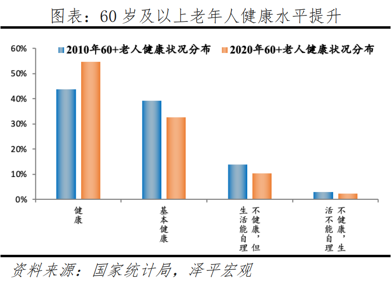 健康水平方面,2010-2020年,60歲及以上人口中,身體健康占比從43.8%升至54.6%,基本健康占比從39.3%降至32.6%,不健康占比從16.8%降至12.3%。