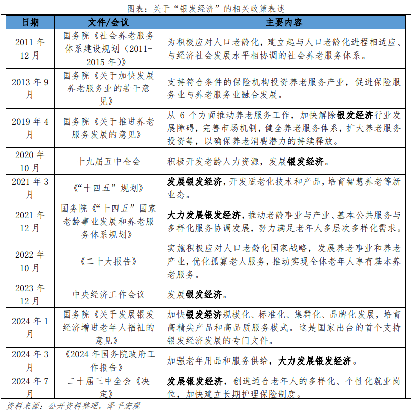 銀發(fā)經(jīng)濟(jì)是向老年人提供產(chǎn)品和服務(wù),以及為老齡階段做準(zhǔn)備等一系列經(jīng)濟(jì)活動(dòng)的總和,既包括“為老”、也包括“備老”。“銀發(fā)經(jīng)濟(jì)”的概念起源于日本,后來(lái)歐美和其他亞洲國(guó)家陸續(xù)提出。我國(guó)在2019年提出“銀發(fā)經(jīng)濟(jì)”概念,2020年提出“發(fā)展銀發(fā)經(jīng)濟(jì)”,2024年1月國(guó)務(wù)院印發(fā)《關(guān)于發(fā)展銀發(fā)經(jīng)濟(jì)增進(jìn)老年人福祉的意見》,是首個(gè)以“銀發(fā)經(jīng)濟(jì)”命名的政策文件,對(duì)銀發(fā)經(jīng)濟(jì)做出明確定義:向老年人提供產(chǎn)品或服務(wù),以及為老齡階段做準(zhǔn)備等一系列經(jīng)濟(jì)活動(dòng)的總和。