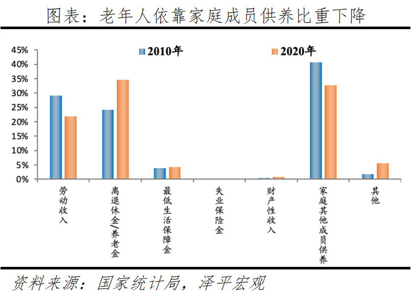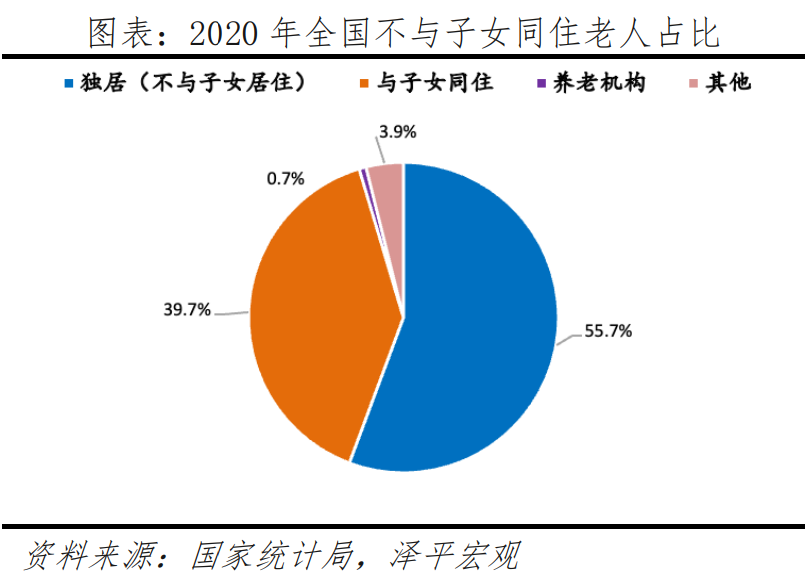 3)居住獨(dú)立、經(jīng)濟(jì)獨(dú)立,空巢老人占比超5成,2010-2020年依靠家庭供養(yǎng)比例從40.7%降至32.7%。隨著傳統(tǒng)觀念轉(zhuǎn)變,疊加家庭規(guī)模不斷縮小、子女?dāng)?shù)量下降、人口流動(dòng)加快,老年人更多選擇不與成年子女同住。根據(jù)七普數(shù)據(jù),全國(guó)有39.7%的老年人與子女同住,55.7%的老年人只與配偶同住或者獨(dú)居。分城鄉(xiāng)看,城市、鎮(zhèn)、鄉(xiāng)村獨(dú)居老人占比分別為52.2%、53%、59.4%,由于農(nóng)村大量年輕勞動(dòng)力外出務(wù)工或定居更發(fā)達(dá)地區(qū),更多老年人獨(dú)居在家。此外,隨著社會(huì)保障體系逐漸完善,更多老年人依靠離退休金生活,經(jīng)濟(jì)條件更加獨(dú)立。根據(jù)人口普查數(shù)據(jù),2010-2020年,60歲及以上人口中,依靠離退休金/養(yǎng)老金的占比從24.1%增至34.7%,依靠家庭其他成員供養(yǎng)的占比從40.7%降至32.7%。