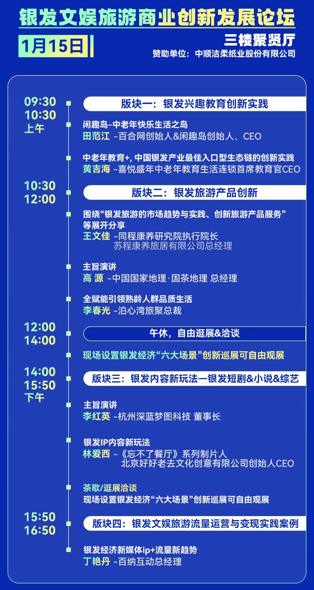 在1月15日啟動(dòng)的平行分論壇(二)——《銀發(fā)文娛旅游商業(yè)創(chuàng)新發(fā)展論壇》上,將圍繞銀發(fā)興趣教育創(chuàng)新實(shí)踐、銀發(fā)旅游產(chǎn)品創(chuàng)新、銀發(fā)內(nèi)容新玩法——銀發(fā)短劇&小說(shuō)&綜藝、銀發(fā)文娛流量運(yùn)營(yíng)與變現(xiàn)實(shí)踐案例等板塊進(jìn)行主題分享,解鎖銀發(fā)文娛旅游與商業(yè)創(chuàng)新的黃金商機(jī),國(guó)內(nèi)外知名銀發(fā)產(chǎn)業(yè)品牌、企業(yè)代表、領(lǐng)域?qū)<?、行業(yè)翹楚等嘉賓將出席活動(dòng)。