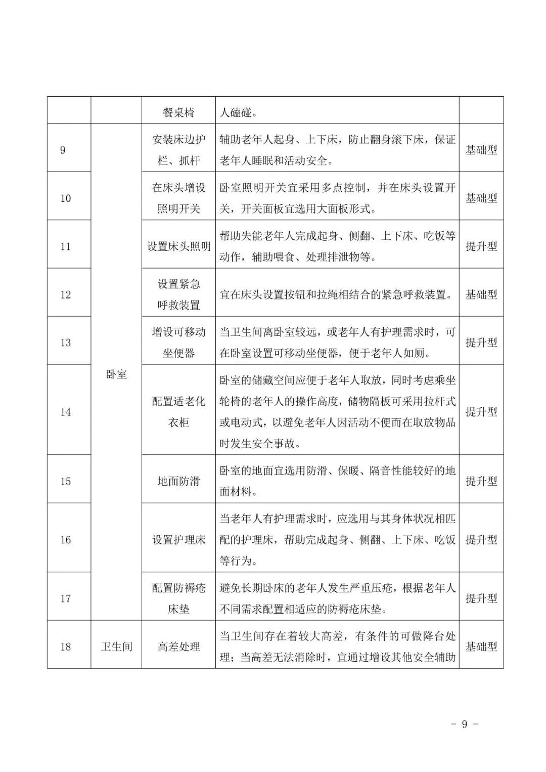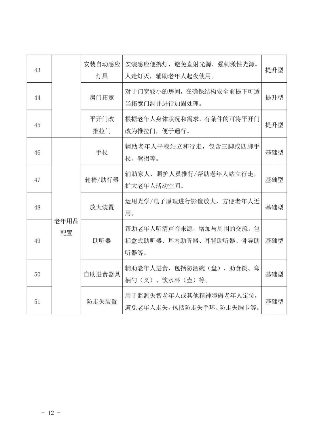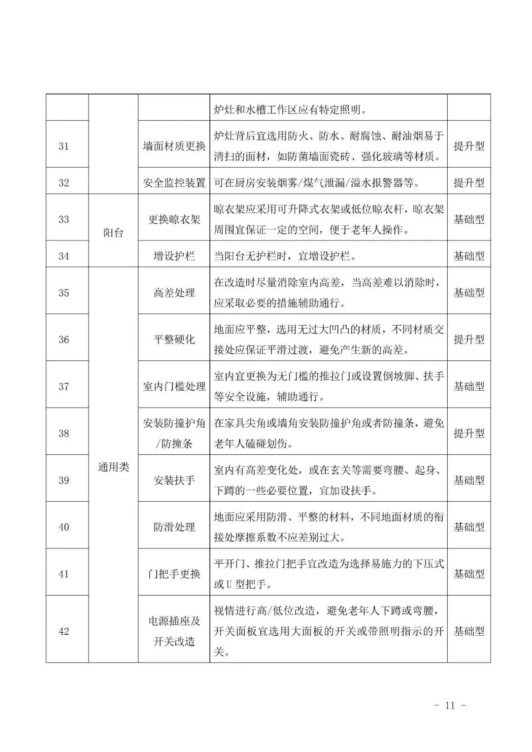 居家適老化改造主要由室內(nèi)空間改造(包括入戶空間、起居廳、臥室、衛(wèi)生間、廚房、陽臺(tái)以及通用類改造)和老年用品配置組成,具體參考廣州市居家適老化改造項(xiàng)目和老年用品配置參考清單(附件1)。