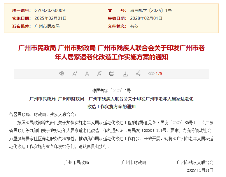 近日,《廣州市民政局 廣州市財(cái)政局 廣州市殘疾人聯(lián)合會(huì)關(guān)于印發(fā)廣州市老年人居家適老化改造工作實(shí)施方案的通知》發(fā)布,并于2025年2月1日起正式實(shí)施。