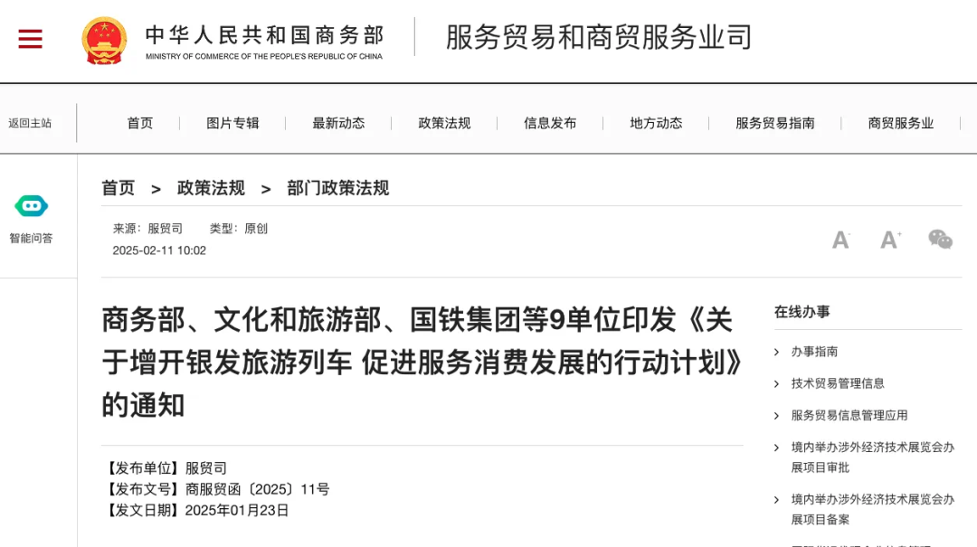 商務(wù)部、文化和旅游部、國鐵集團等9單位印發(fā)《關(guān)于增開銀發(fā)旅游列車 促進服務(wù)消費發(fā)展的行動計劃》的通知