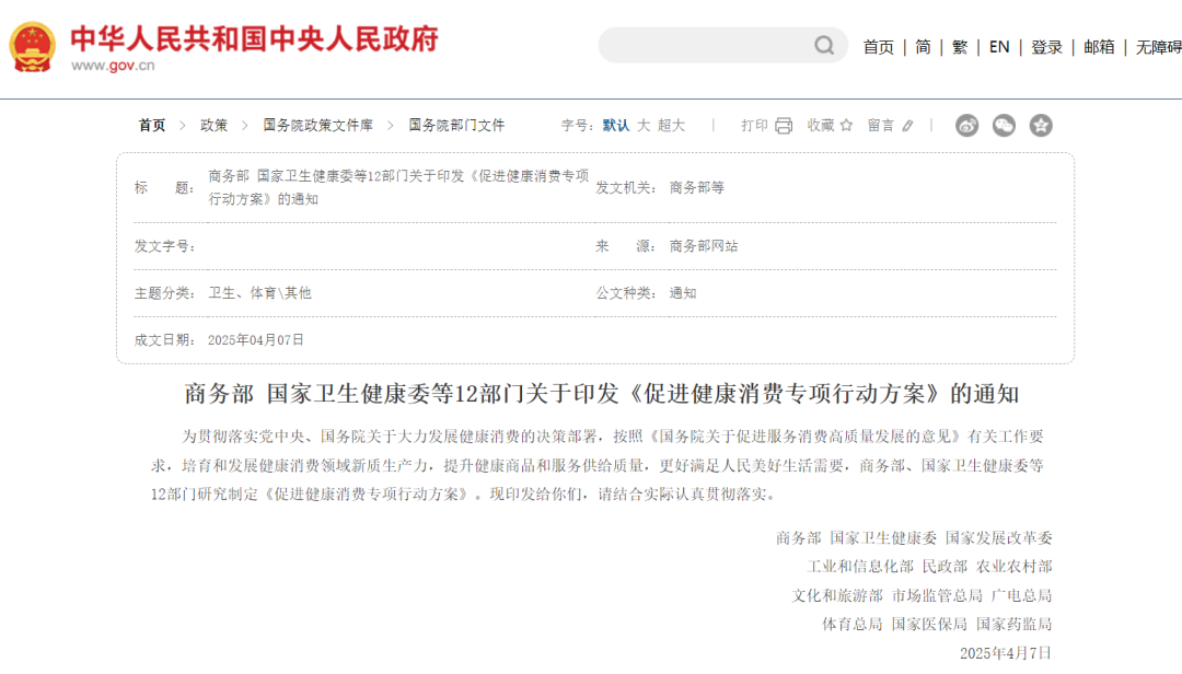 商務部 國家衛(wèi)生健康委等12部門關于印發(fā)《促進健康消費專項行動方案》的通知