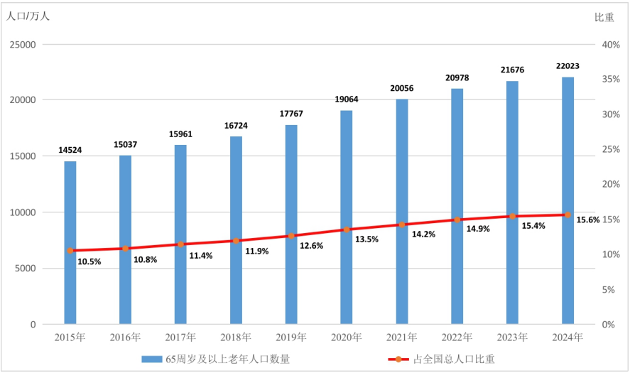 圖2 2015—2024年全國(guó)65周歲及以上老年人口數(shù)量及占全國(guó)總?cè)丝诒戎?/span>
