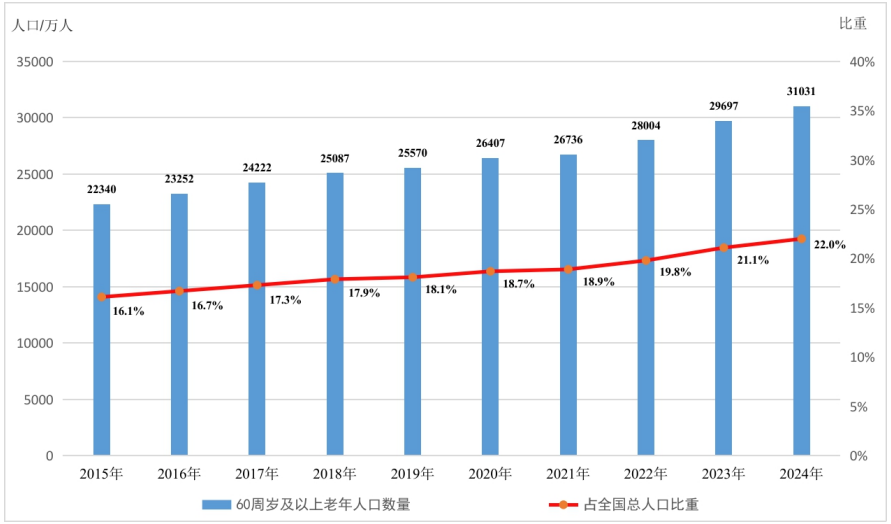 圖1 2015—2024年全國(guó)60周歲及以上老年人口數(shù)量及占全國(guó)總?cè)丝诒戎?/span>