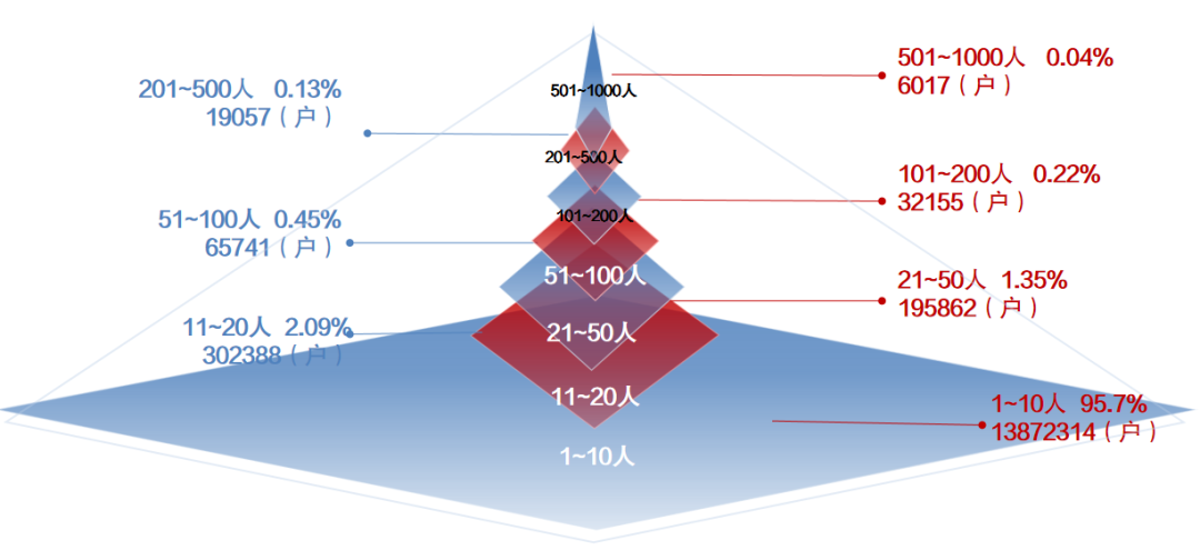 從養(yǎng)老企業(yè)從業(yè)人員規(guī)模看,95%以上的養(yǎng)老產(chǎn)業(yè)企業(yè)從業(yè)人數(shù)在10人以下,累計(jì)13,872,314戶,以微型經(jīng)營主體為主,企業(yè)主體呈現(xiàn)出數(shù)量多、規(guī)模小、分散度高的特征,且從業(yè)人員配置十分精簡。